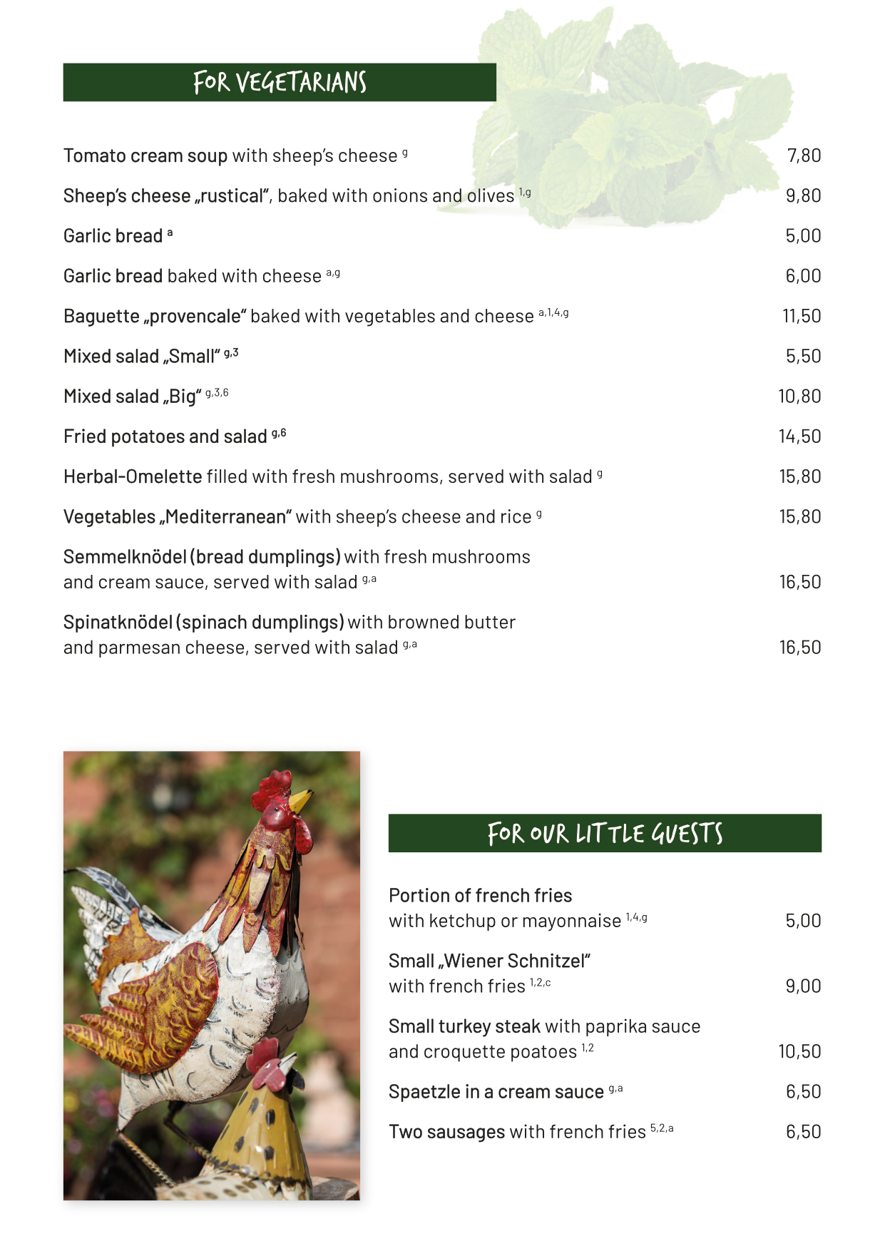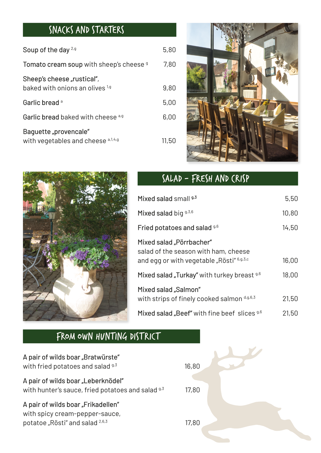 The current owner Jens Schmidt-Zöllner acquired the rural property in 1998 and converted it with great attention to detail into a stylish country restaurant with a very special charm. In doing so, it was important to him to preserve the original buildings with their farmhouse character. The result is a popular restaurant with a rustic gallery and a cozy hunting room that can accommodate 72 guests. The idyllic beer garden with its unmistakable atmosphere has room for 120 people. The Pörrbacher Hof also offers the perfect setting for parties, as the special ambience of the estate makes private and business celebrations unforgettable experiences. As an alternative to the extensive à la carte selection, the chef can create special menus or stylish buffets on request, also according to your own suggestions. Fresh game from the restaurateur's own hunting ground is a particular specialty of the house.
